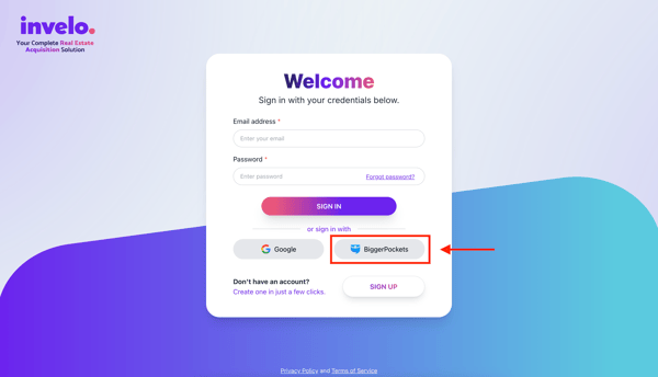 - If you don't have an Invelo account yet, sign up for an account in the Invelo registration page. Make sure to use the Sign up using BiggerPockets option.