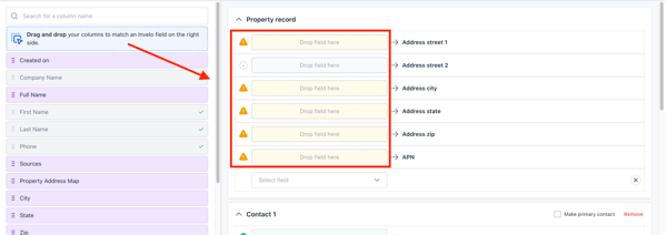 - You can manually map these by dragging and dropping your columns to match an Invelo field.