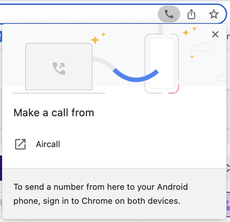 Click a phone number in Invelo and your browser will open your default calling app. If you are using Google Chrome, the following notification will display below your search bar. Click the name of the calling app (in the below example, it would be Aircall) and your phone call will start.