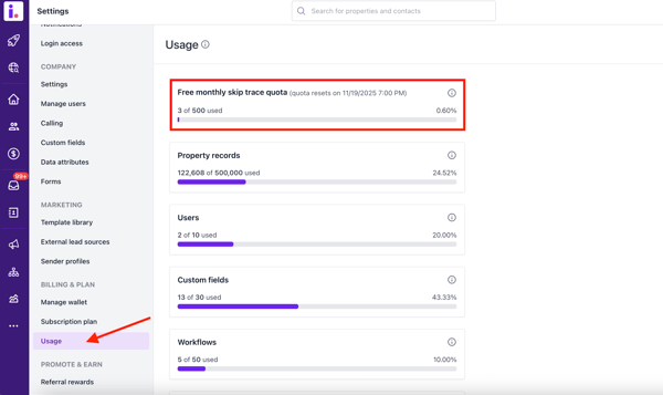 Each Invelo plan includes free skip tracing credits that automatically refresh every month. These credits let you find updated contact information—like phone numbers and email addresses—for property owners in your lists, helping you connect with motivated sellers faster.