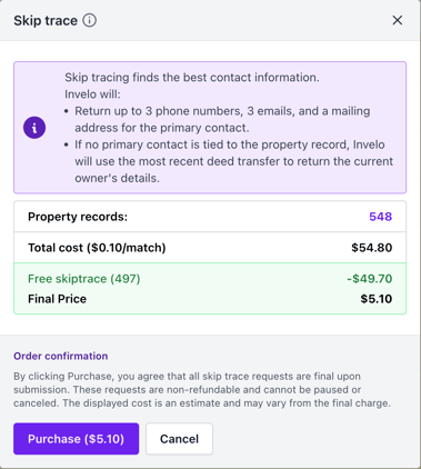 If the number of records you skip trace goes beyond your available free credits, the system will prompt you to confirm the purchase amount before deducting from your wallet credits.