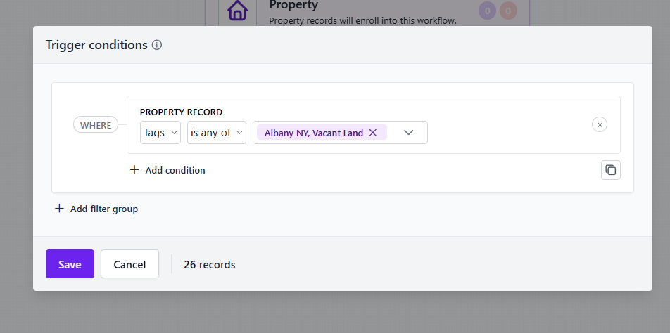 Then, you create a workflow with a trigger condition: Tags is any of Vacant land.